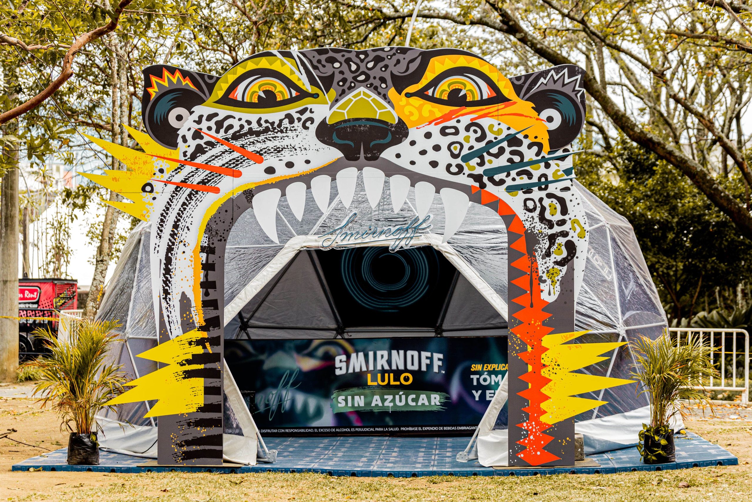 Domo Geodesico de 6mt de diámetro personalizado con neon flex en estructura, telas personalizadas, para el ingreso se realizo estructura tipo arco con tigre abriendo la boca personalizado.